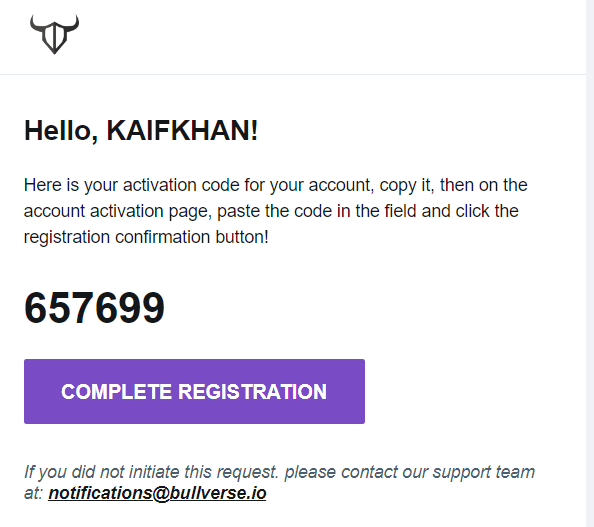 * Check your email for a verification message from BullVerse. Click the link provided to activate your account OR enter the Activation code for Complete Registration.